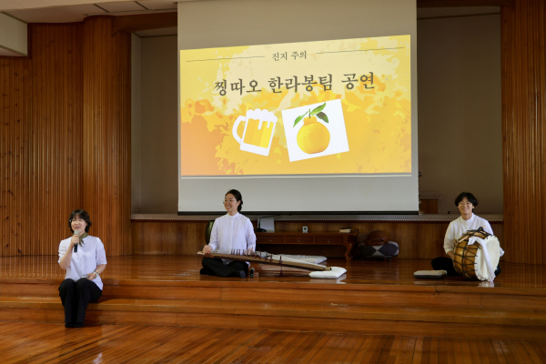 그동안 두 분은 늘 긍정적인 모습으로 학생들과 허물없이 어울리며 밝은 에너지를 전해 주셨고, 학생들에게는 정감 가는 삼촌 같은 존재였는데요. 그래서인지 이번 졸업식은 어느 때보다 감동적이고 훈훈한 분위기 속에서 진행되었습니다. 학산님은 졸업 감상담을 통해 영산 성지에서 학생들과 함께 어울리며 살 수 있어 행복했다는 말씀을, 김무생 교우님은 간사 때부터 이어진 4년 동안의 길에 처음으로 ‘맺음’을 하는 것 같다는 눈물겨운 감상을 나누어 주셨습니다. 이후 학생들이 정성껏 준비한 축하 영상과 선물, 김성식 교우의 감미로운 축가, 그리고 ‘칭따오와 한라봉’(사합지졸) 팀의 공연으로 더욱 풍성한 자리가 되었습니다.