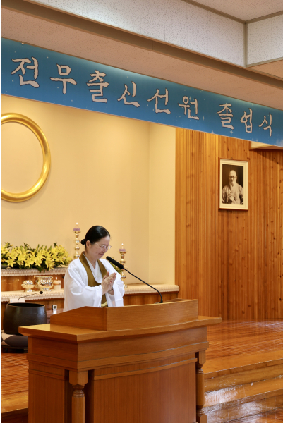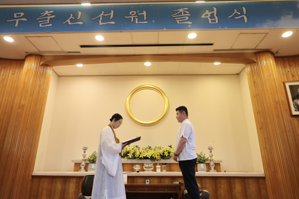 8월 18일, 제 9기 전무출신선원 졸업식이 열렸습니다. 이번 졸업식에서는 기간제 전무출신을 서원한 제주교당 출신 학산 김성진 교우님과 봉공직 전무출신을 서원한 칭따오교당 출신 김무생 교우님이 영산에서의 1년간 수학과정을 마치고 졸업하게 되었습니다.